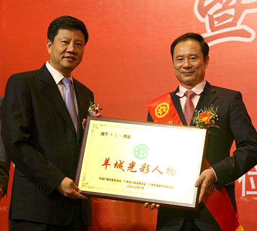 黃董從陳市長(zhǎng)手中接過(guò)“羊城光彩人物”光榮稱號(hào)牌匾