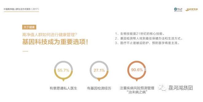 他們信賴醫(yī)學(xué)科技,高度注重健康,健康管理方式比普通人更加超前。27.1%有過基因檢測經(jīng)歷,55.7%有意愿聘請私人醫(yī)生。