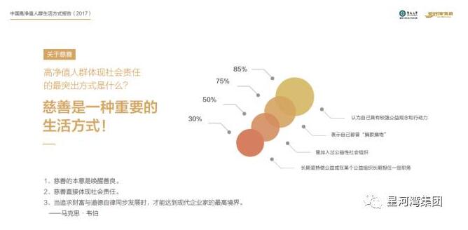 更為重要的是,他們普遍具備社會(huì)責(zé)任感,將慈善視為重要的生活方式之一。75%的高凈值人群曾經(jīng)捐款捐物,一半以上加入過公益性社會(huì)組織,30%長期堅(jiān)持做公益,或在某個(gè)公益組織長期任職。